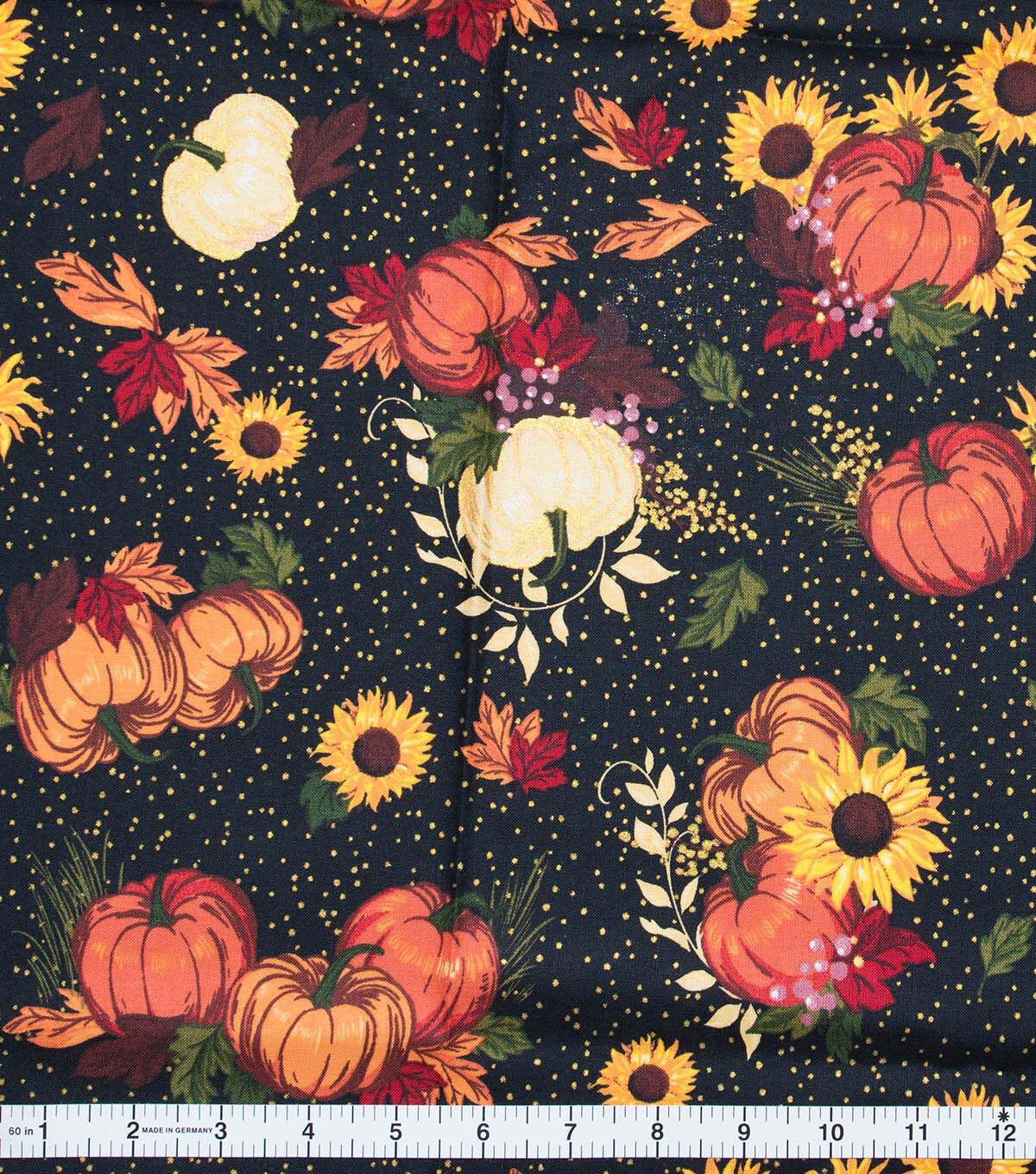 Flowers & Pumpkins On Black Dot Fall Print Cotton Fabric