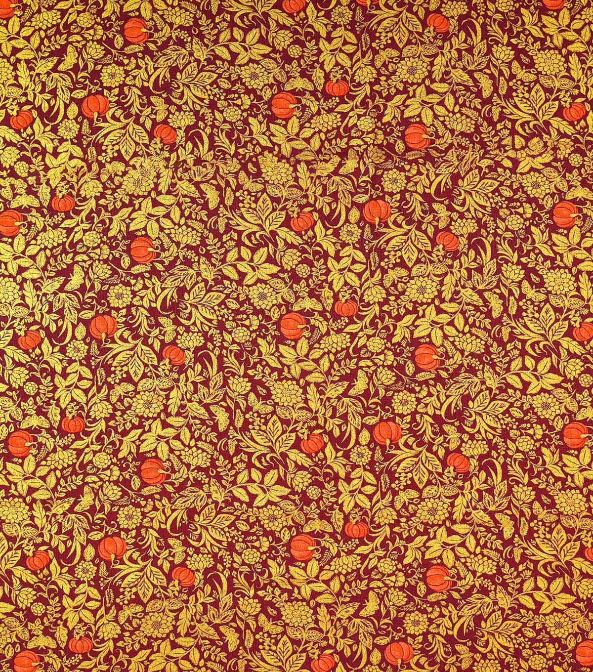 Fall Metallic Pumpkins & Vines on Burgundy Glitter Cotton Fabric