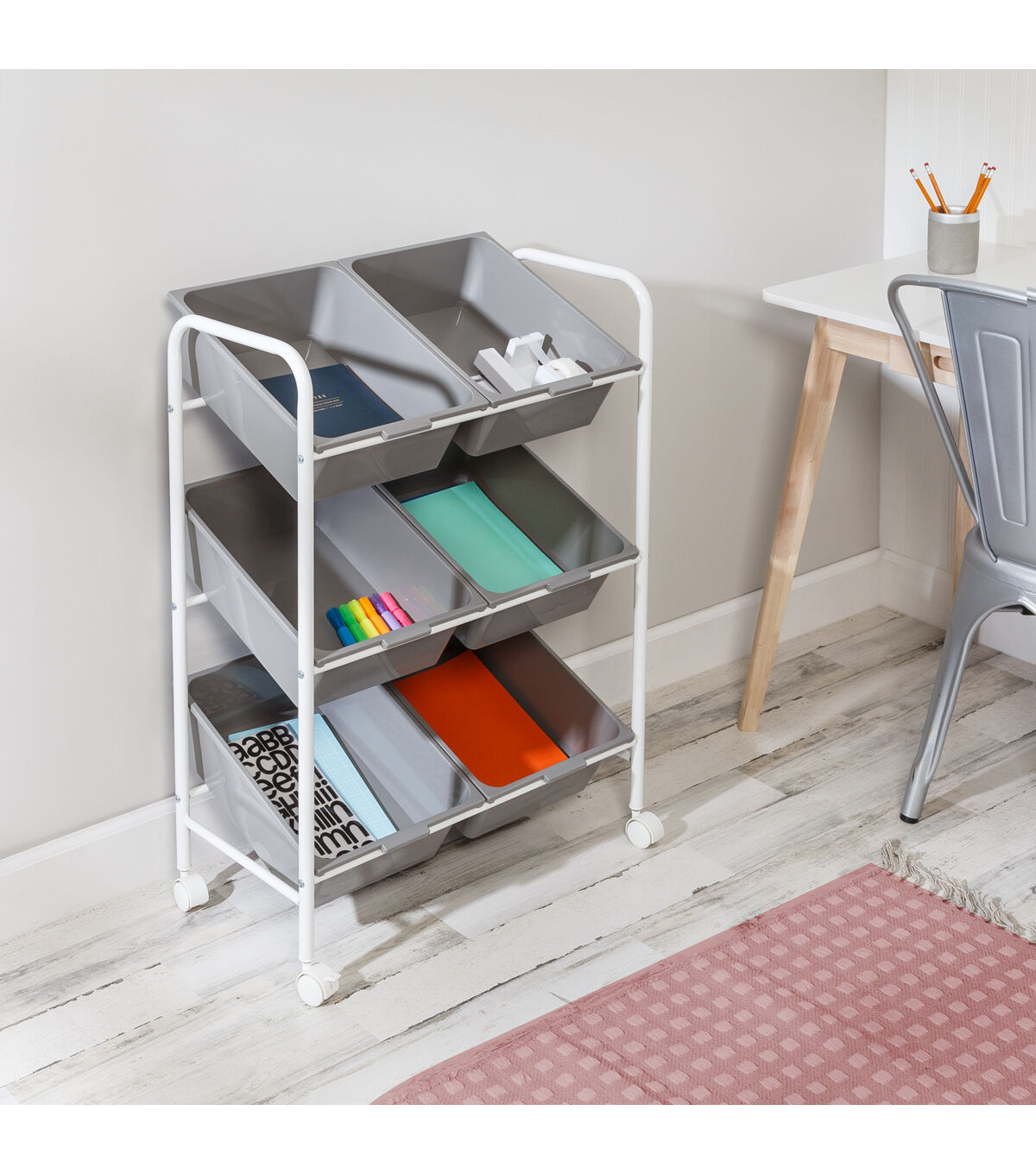 Honey Can Do 24" x 34" Gray & White 6 Bin Rolling Storage & Craft Cart